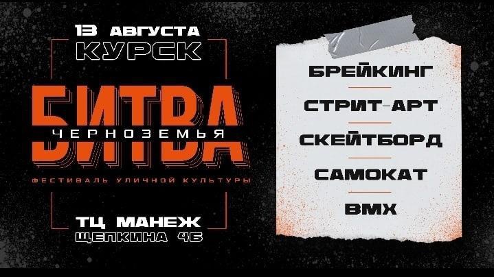 Продолжаем знакомить с мероприятиями, которые пройдут в Курске 13 августа в День физкультурника. На площадке перед ТЦ «Манеж» (ул. Щепкина, 4Б) состоится фестиваль уличной культуры «Битва Черноземья». Проект поддержан Федеральным агентством по делам молодежи и арт-кластером «Таврида».