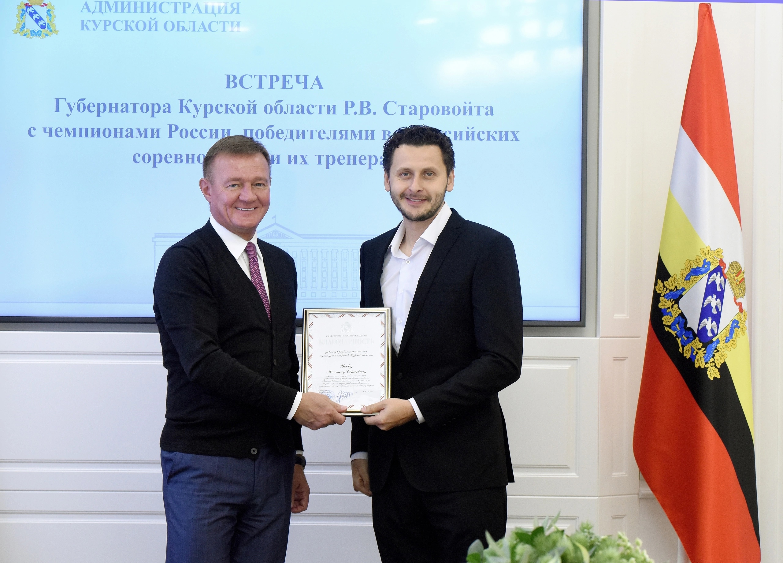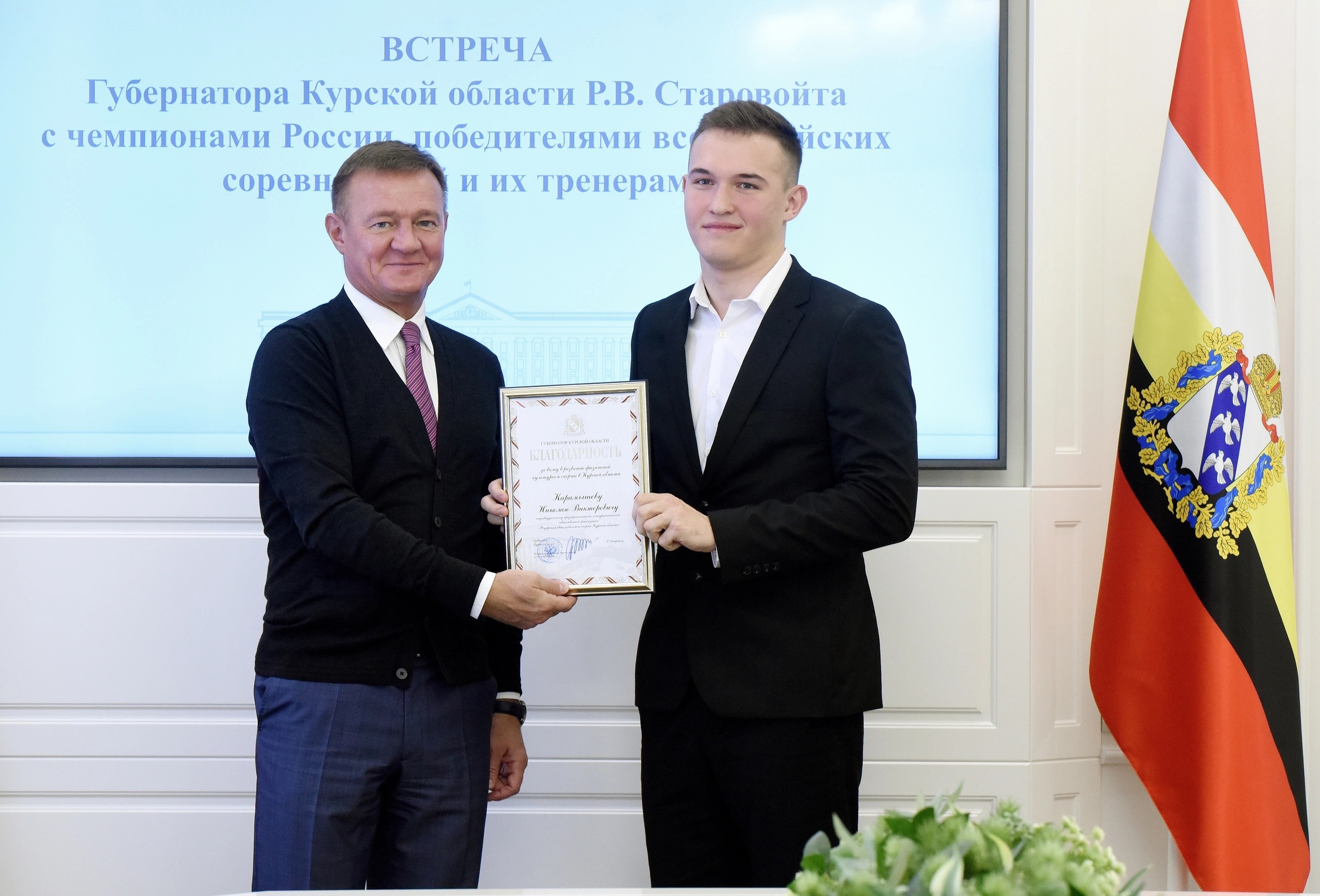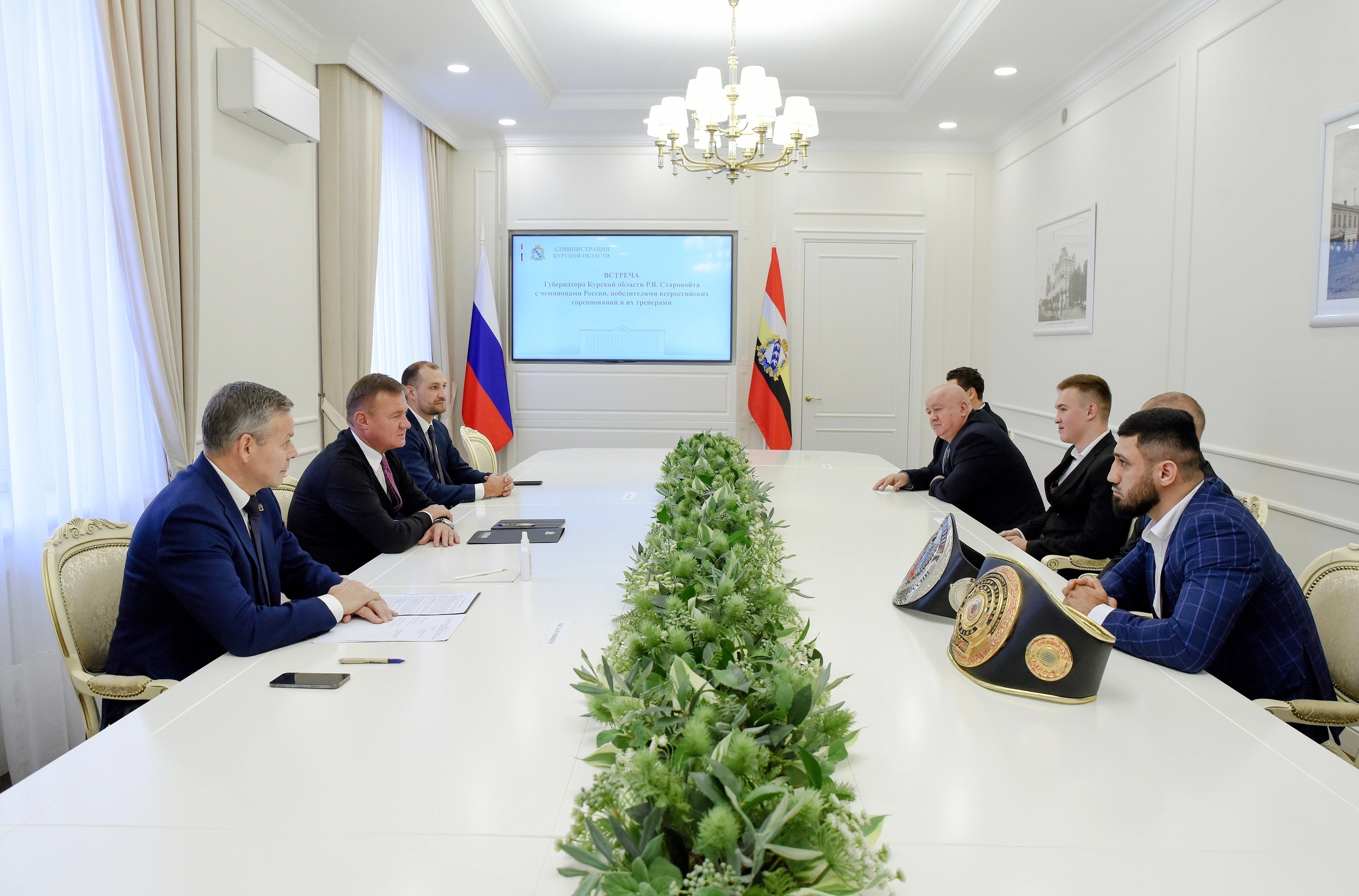 Губернатор Роман Старовойт встретился с курскими спортсменами, которые летом и осенью этого года стали победителями чемпионатов страны, всероссийских соревнований, и их тренерами.