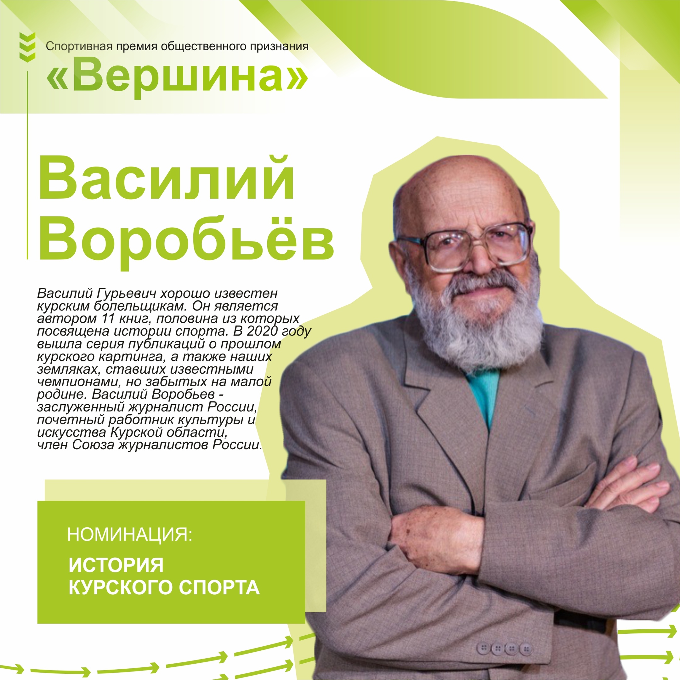 В номинации «История курского спорта» отмечен известный курский журналист, автор многих публикаций о судьбах известных чемпионов Василий Гурьевич Воробьев. Сегодня его статьи можно встретить в газете «Городские известия», есть они и у нас в группе. Найдете их по хештегу.