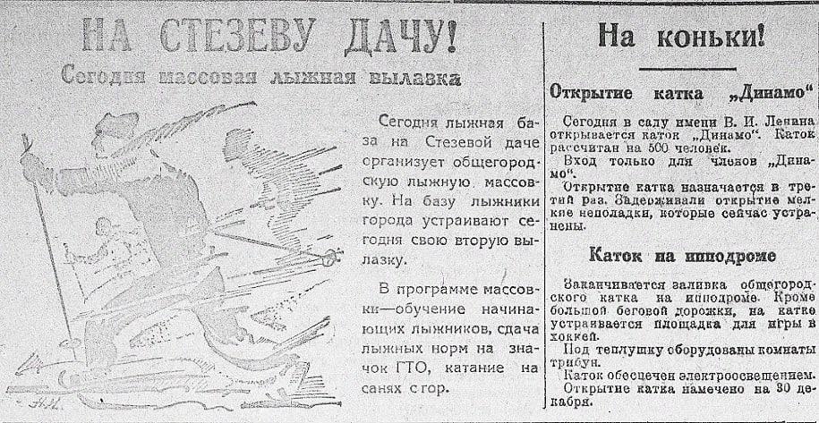 В статье газеты «Курская правда» от 24 декабря 1934 года горожанам предлагалось покататься на лыжах на Стезевой даче, посетить каток на стадионе «Динамо» или на ипподроме. «В программе массовки — обучение начинающих лыжников, сдача лыжных норм на значок ГТО, катание на санях с гор», — говорится в статье.