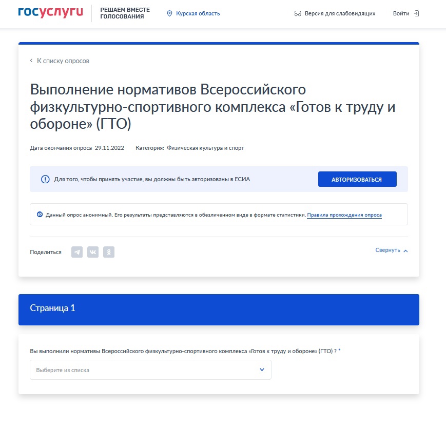 На портале Госуслуг можно пройти опрос, посвященный Всероссийскому физкультурно-спортивному комплексу «Готов к труду и обороне». Голосование проводится до 29 ноября 2022 года. Результаты будут проанализированы специалистами и использованы для дальнейшего развития комплекса ГТО в Курской области.