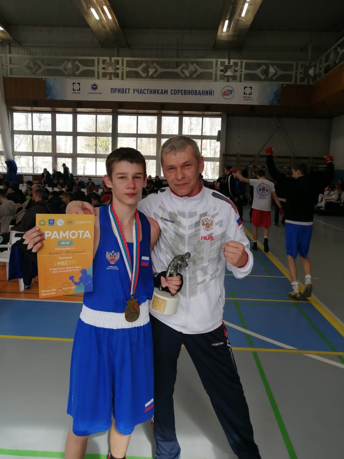 В Обнинске на первенстве Центрального федерального округа по боксу среди юношей 15-16 лет сборная Курской области завоевала семь медалей. Воспитанник спортивной школы олимпийского резерва «Урожай» Владислав Алябьев стал лучшим в весовой категории 48 кг.