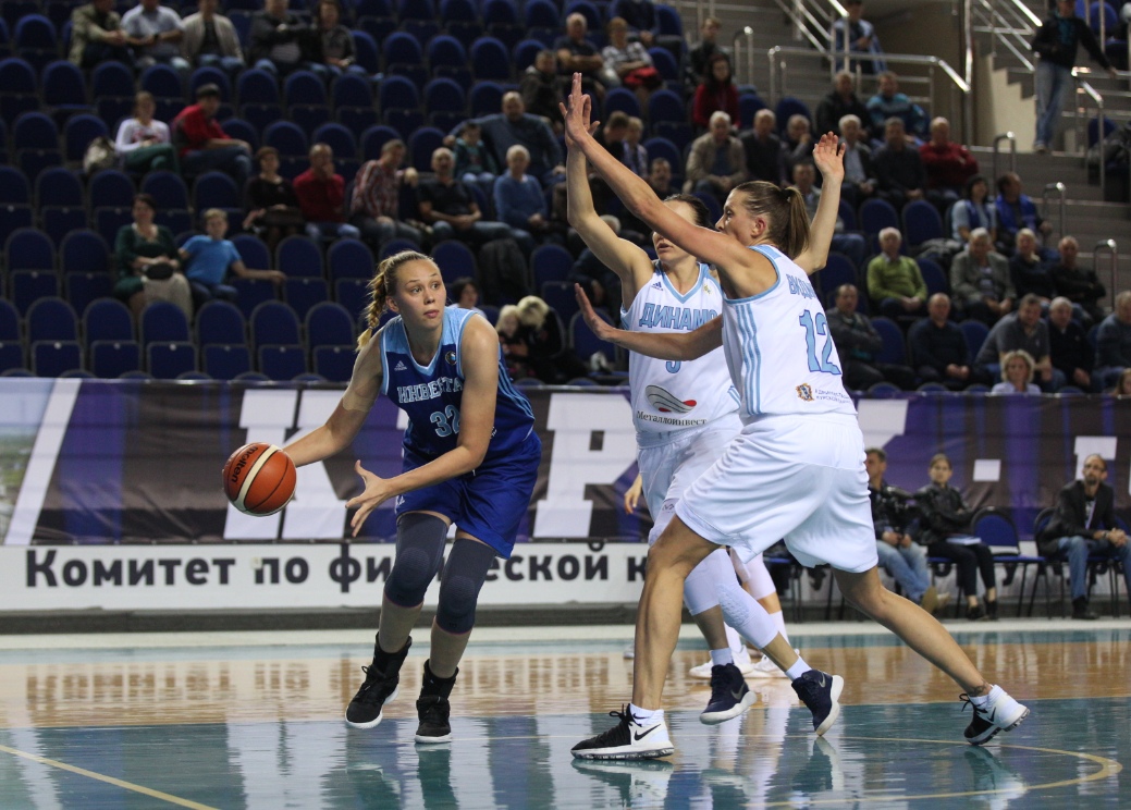 В стартовом составе «Инвенты» вышли: Олеся Сафонова, Юлия Козик, Ольга Фролкина, Анна Пачурина, Елизавета Шабанова. Счет в матче открыла динамовка Наталья Анойкина, реализовав 2 очка и забив бонусный штрафной. Елизавета Шабанова ответила 2-очковым броском. Первые 3 минуты встрече в целом прошли результативно. 7:6 в пользу «Динамо». Затем правда, соперники усилиями Видмер, Круз и Кирилловой, ушли в отрыв (19:10). И лишь после затяжной «засухи» Анна Буровая отметилась 3-мя очками.